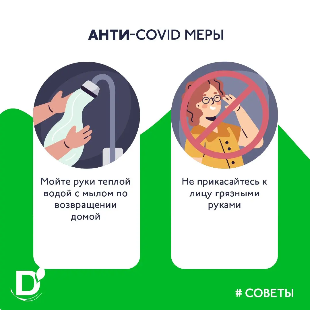 - Не прикасайтесь к лицу грязными руками. Особенно к глазам, носу, рту. Именно через слизистые вирус проникает в организм.