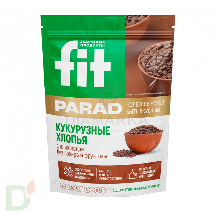 <h2>Натуральный состав, средний гликемический индекс и приятный вкус</h2> <ul> <li>Вот они, основные преимущества хлопьев ФитПарад! Как такое возможно?</li> <li> В составе хлопьев нет сахара. Вместо него используются натуральные подсластители: сукралоза и стевиозид.</li> <li> Хлопья сделаны не из муки, а из крупы. Это позволяет снизить гликемический индекс.</li> <li> Продукт содержит инулин - растворимое пищевое волокно, он же - пребиотик.</li> </ul> <h2>Инулин обладает рядом полезных свойств</h2> <ol> <li>питает полезные бактерии, которые живут в ЖКТ человека, тем самым помогая наладить пищеварение;</li> <li> во время прохождения по ЖКТ инулин увеличивается в объеме (за счет впитывания жидкости). Это способствует более быстрому насыщению, а также улучшает стул;</li> <li> так как инулин - это клетчатка, он замедляет процесс всасывания углеводов, тем самым снижая ГИ продукта.</li> </ol> <h2>Энергетическая ценность хлопьев ФитПарад со вкусом шоколада</h2> На 100 грамм: 317 кКал / 1326 кДж; белки - 9 г, жиры - 2 г, углеводы - 64 г (из них моно- и дисахариды - 1,2 г, крахмал - 40 г), пищевые волокна - 10,1 г (из них полифруктозаны - 4,5 г)<br> <h2>Состав шоколадных хлопьев ФитПарад</h2> крупа кукурузная, какао порошок, инулин, соль йодированная, премикс витаминный, подсластитель - сукралоза (Е955), подсластитель - стевиозид (Е960).<br>