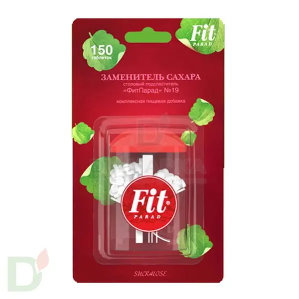 <p> ФитПарад № 19 заменитель сахара на основе сукралозы, 150 таблеток - инновационный сахарозаменитель. Обладает великолепным вкусом и улучшенными потребительскими свойствами благодаря сбалансированному составу тщательно подобранных компонентов.  Рекомендуем использовать для замены сахара при диабете и при диетах для снижения веса. </p> <h1>1 таблетка "ФитПарад" №19 = 1 чайной ложке сахара</h1> <p> <br> <strong>Рекомендации по применению:</strong> перед употреблением растворить в жидкости. </p> <h2>Безопасная доза суточного потребления - 20 таблеток.</h2> <p> <strong>Состав: </strong>лактоза, подсластитель - сукралоза, инулин L-лейцин, стабилизатор кроскармеллоза, антислеживающий агент - диоксид кремния.<br> <br> <strong>Пищевая ценность, в 100 г продукта:</strong> белки - 0 г., углеводы - 73,3 г., жиры - 0 г.<br> <br> <strong>Энергетическая ценность в 100 г продукта, кКал:</strong> 290 кКал / 1260 кДж.<br> <br> <strong>Срок годности с даты изготовления: 2 года.</strong><br> <br> </p>