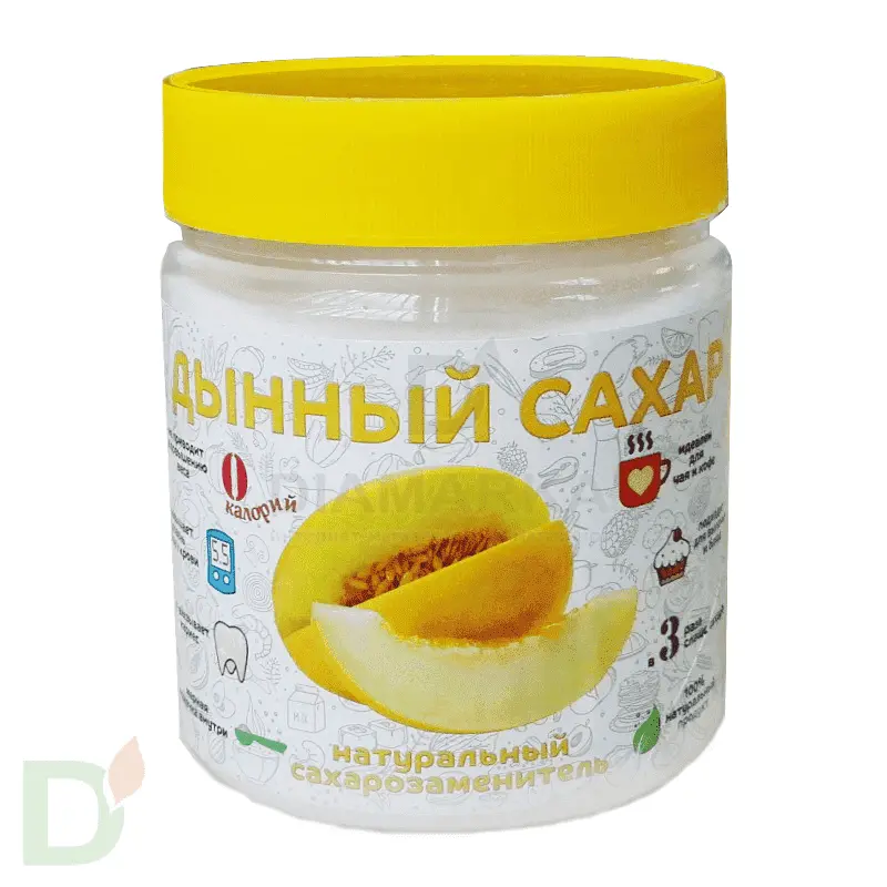 <h3>Отличный заменитель сахара для выпечки и чая</h3> <p>  Натуральный сахарозаменитель "Дынный сахар" придётся по вкусу диабетикам! </p> <p> В основе - натуральный заменитель <strong>эритритол</strong>. Его называют "дынным сахаром", потому что в высокой концентрации он встречается именно в дынях. Помимо этого эритрит получают из кукурузы, груш, винограда путём ферментации. </p> <p> Среди преимуществ "Дынного сахара": </p> <ul> <li>Нулевой гликемический индекс (без углеводов, калорий, белков, жиров);</li> <li>Невысокая концентрация - трудно переборщить (в 3 раза слаще сахара);</li> <li>Подходит для добавления в чай, выпечку, десерты.</li> </ul> <p> Особенно "Дынный сахар" хорош для приготовления десертов, в которых принципиально важен объём добавленного сахара (а в нашем случае - заменителя). Большинство современных заменителей имеют концентрацию в 10 раз слаще сахара, "Дынный сахар" же только в 3 раза слаще. По форме этот заменитель - вылитый сахар: рассыпчатые сладкие кристаллики. Не имеет постороннего привкуса, присущего таблетированным заменителям на сукралозе и аспартаме. </p> <p> <strong>Состав</strong>: эритритол, натуральный экстракт стевии. </p> <p> В наборе идёт <strong>мерная ложка</strong> на 4г продукта </p> <p>   </p> <p>   </p>